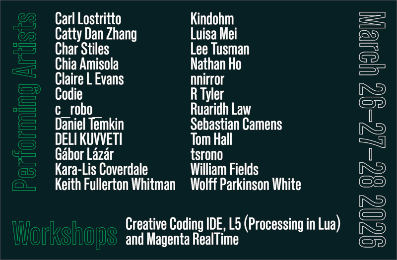 Carl Lostritto, Catty Dan Zhang, Char Stiles, Chia Amisola, Claire L Evans, Codie, Daniel Temkin, DELI KUVVETI, Gábor Lázár, Kara-Lis Coverdale, Keith Fullerton Whitman, Kindohm, Luisa Mei, Nathan Ho, nnirror, R Tyler, Ruaridh Law, Sebastian Camens, Tom Hall, tsrono, William Fields, Wolff Parkinson White, and c_robo_.