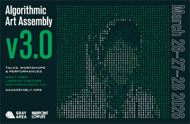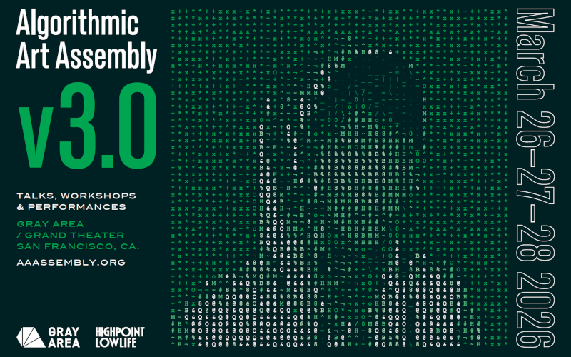 Early bird tickets are now available. Visit Gray Area for Algorithmic Art Assembly 2026—where art is computed, music is compiled, and the future is rendered in real time.