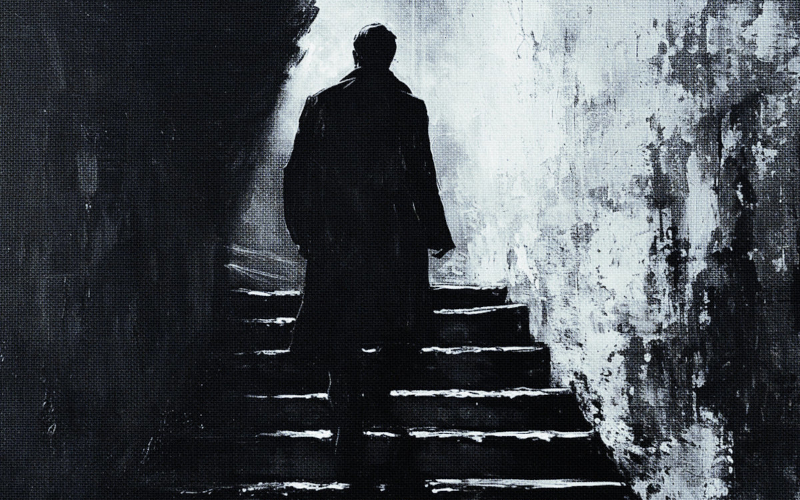 All I can find to explain what is here are endless crime dramas, particularly those that emphasize cynical attitudes and motivations, a dark noir album filled with harmonic textures and creeping reverbs. I am running for my life, going deeper into the darkness and it all seems hopeless. Picture a murder scene with a guy coming up the stairs as seen from behind. He wears a long coat. Humphrey Bogart; Robert Mitchum; Peter Lorre; Robert Ryan all are my latest victims in these sinister stories brought forth in a shadowy cinematographic style. The concept of chiaroscuro is the use of strong contrasts between light and dark, employing unusually bold contrasts affecting the whole composition.