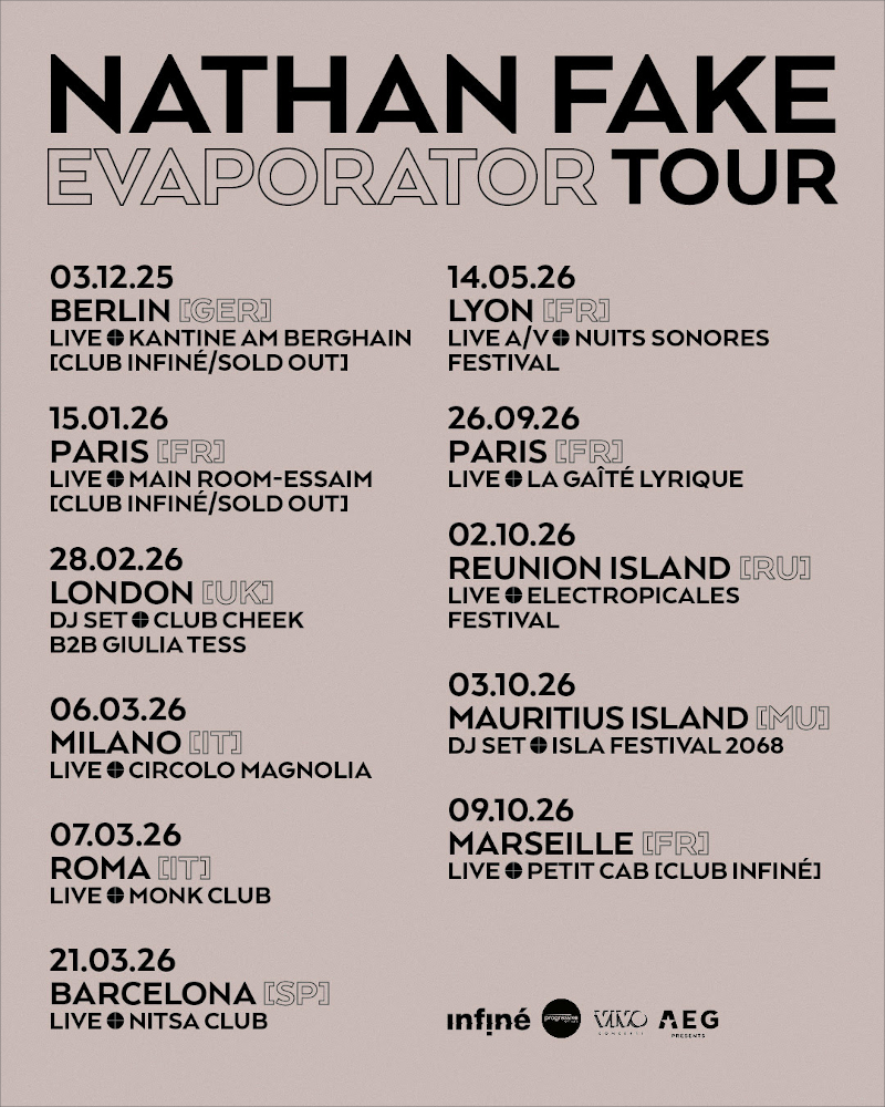 After a longish hiatus comes Evaporator, Nathan Fake returning with the product of six weeks last summer distilling two decades of self-inquiry into a lucid tactile form of ‘airy daytime music’ (his words). His first InFiné outing shifts from the night-time kicks of Blizzards (2020) and Crystal Vision (2023) towards light and aperture; analog synths and rhythmic architecture bristle with space and pace, density dissolved into motion—wind in hair, wide skies, open plains. You get the picture.