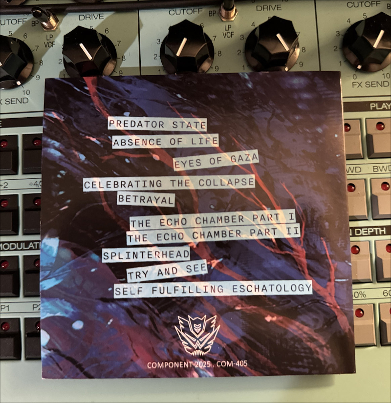 This is brutalist sound architecture—what you’d expect from veterans like Scorn, The Panacea, Submerged, or Mothboy: mangled breakbeats, snarling low-end, and percussion that ricochets like a weaponized machine shop. As the record surges forward, the descent grows steeper. “Betrayal” channels a haunting throwback to Rhys Fulber’s mechanical atmospheres, dragging its slow-burning cadence into interstellar voids. Meanwhile, “Splinterhead” hits with a barrage—an electrified shield of rhythm that overwhelms and obliterates.